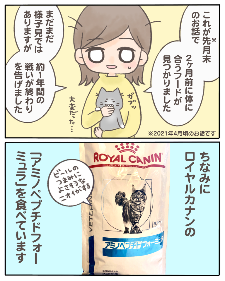 猫の『少食』の原因がわかった話【06】 2021/03/06 猫の『少食』の原因がわかった話06 1話から読む前の話はこちら ちょうど海外で「猫が新型コロナに感染した」というニュースが出ていた時期だったのでセカンドオピニオンは諦めました。とりあえず自分にできることは猫についての知識を増やすことだと、必死に勉強しました ... 猫の『少食』の原因がわかった話06 1話から読む前の話はこちら ちょうど海外で「猫が新型コロナに感染した」というニュースが出ていた時期だったのでセカンドオピニオンは諦めました。とりあえず自分にできることは猫についての知識を増やすことだと、必死に勉強しました。避妊手術は無事に終わり、様子をみつつフードを術後用に変えていきましたが食事量は増えませんでした。少し値が張るようなプレミアムフードも試してみましたが、食いつきがいいだけで特に普通のものと変わりなかったです。そんな時にニキビが悪化し下唇が腫れているのに気付きました。1日でバッと腫れたのでダッシュで病院へ。つづきはこちら ◯読者登録はこちら◯◯メインのブログ◯◯電子書籍◯ タグ :#猫の『少食』の原因がわかった話 続きを読む