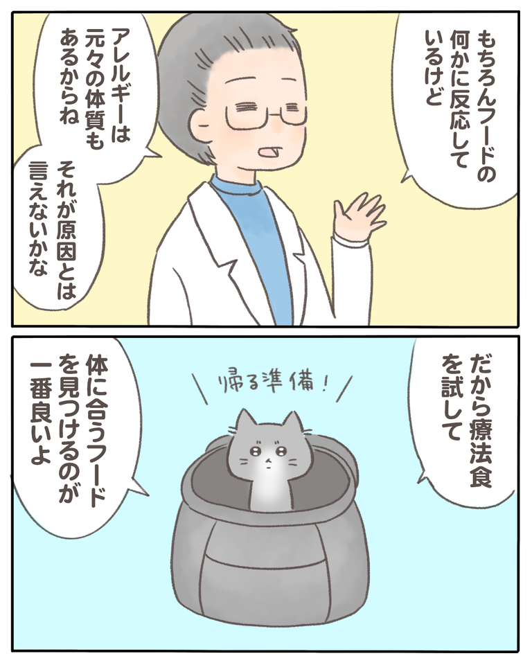 猫の『少食』の原因がわかった話【11】 2021/04/02 猫の『少食』の原因がわかった話11 1話から読む前の話はこちら アレルギー検査は費用がとても高くなるからと先生に勧められて「除去食試験」を行う事になりました。食べているフードを数ヶ月おきに変更して、アレルギー反応が出るかどうか試すものらしいです。療法食 ... 猫の『少食』の原因がわかった話11 1話から読む前の話はこちら アレルギー検査は費用がとても高くなるからと先生に勧められて「除去食試験」を行う事になりました。食べているフードを数ヶ月おきに変更して、アレルギー反応が出るかどうか試すものらしいです。療法食である「皮膚ケア」のフードを購入して帰ったのですが、体に合わなく嘔吐してしまいました…つづきはこちら ◯読者登録はこちら◯◯メインのブログ◯◯電子書籍◯ タグ :#猫の『少食』の原因がわかった話 続きを読む
