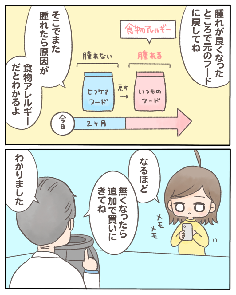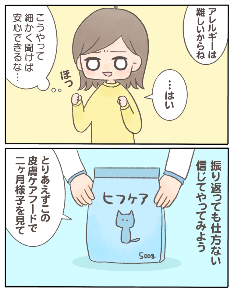 猫の『少食』の原因がわかった話【09】 2021/03/22 猫の『少食』の原因がわかった話09 1話から読む前の話はこちら 皮膚が腫れてしまうのは「食物アレルギー」かもしれない。と先生に言われてびっくりしました。猫にもアレルギーがあるなんて…!花粉症はあると聞いていたけどまさか自分の猫がそんな事になっているとは ... 猫の『少食』の原因がわかった話09 1話から読む前の話はこちら 皮膚が腫れてしまうのは「食物アレルギー」かもしれない。と先生に言われてびっくりしました。猫にもアレルギーがあるなんて…!花粉症はあると聞いていたけどまさか自分の猫がそんな事になっているとは思いもしませんでした。主にタンパク質が原因になることが多いらしいのですが、穀物などに反応する子もいるそうです。なので、今まで「良質なタンパク質をあげたい」と思っていた私の行動は良くなかったのかも…と後悔していました。つづきはこちら ◯読者登録はこちら◯◯メインのブログ◯◯電子書籍◯ タグ :#猫の『少食』の原因がわかった話 続きを読む