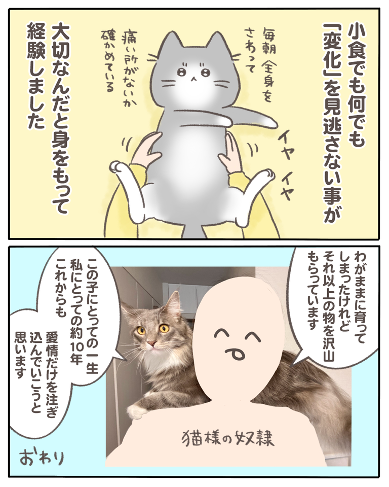 猫の『少食』の原因がわかった話【15】 2021/04/24 猫の『少食』の原因がわかった話151話から読む前の話はこちら ここまで読んでいただきありがとうございました。無事に1歳を迎えまして毎日元気いっぱいに走り回っています。猫は辛いことを隠してしまいがちで元気で健康そうに見えてしまいます。体調が悪そうにしだしたら手遅 ... 猫の『少食』の原因がわかった話151話から読む前の話はこちら ここまで読んでいただきありがとうございました。無事に1歳を迎えまして毎日元気いっぱいに走り回っています。猫は辛いことを隠してしまいがちで元気で健康そうに見えてしまいます。体調が悪そうにしだしたら手遅れの場合が多いようなのでこれからも少しの変化を見逃さないよう定期的に検診に連れて行こうと思います。おわり※2021年4月頃に描いたお話です。◯読者登録はこちら◯◯メインのブログ◯◯電子書籍◯◯掲載中のマンガ◯ タグ :#猫の『少食』の原因がわかった話 続きを読む