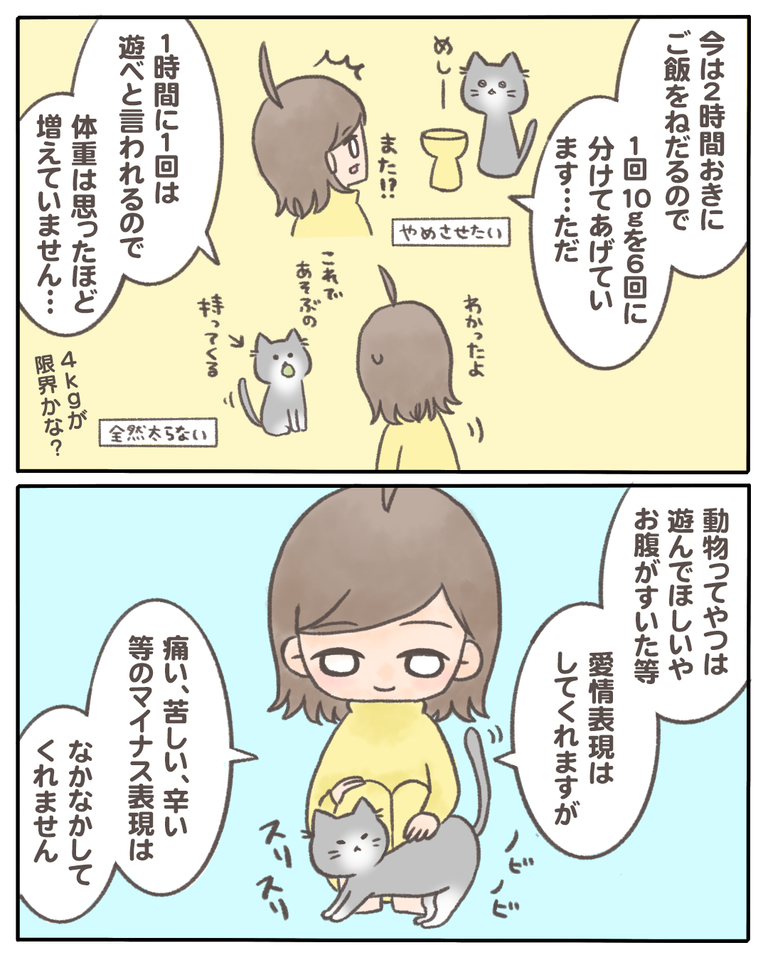 猫の『少食』の原因がわかった話【08】 2021/03/18 猫の『少食』の原因がわかった話08 1話から読む前の話はこちら こんな事を言ってしまうと世の中のお母さんに失礼かもしれませんが「擬似子育て」している気分でして…なんでうちの子ばっかり!ってなってしまっていました。他の子と比べても仕方ないのはわかっていて ... 猫の『少食』の原因がわかった話08 1話から読む前の話はこちら こんな事を言ってしまうと世の中のお母さんに失礼かもしれませんが「擬似子育て」している気分でして…なんでうちの子ばっかり!ってなってしまっていました。他の子と比べても仕方ないのはわかっていても猫のSNSを見ていると同じ月齢の子猫達がどんどん大きくなるのを少し歪んだ目で見ていました。親にはなれそうにもありません…今は私の唯一の家族。今更、この子が居なくなる事なんて考えられないので生きていてくれる限り守り続けたいです。むしろ私が死ぬまで一緒にいてほしいです←つづきはこちら ◯読者登録はこちら◯◯メインのブログ◯◯電子書籍◯ タグ :#猫の『少食』の原因がわかった話 続きを読む