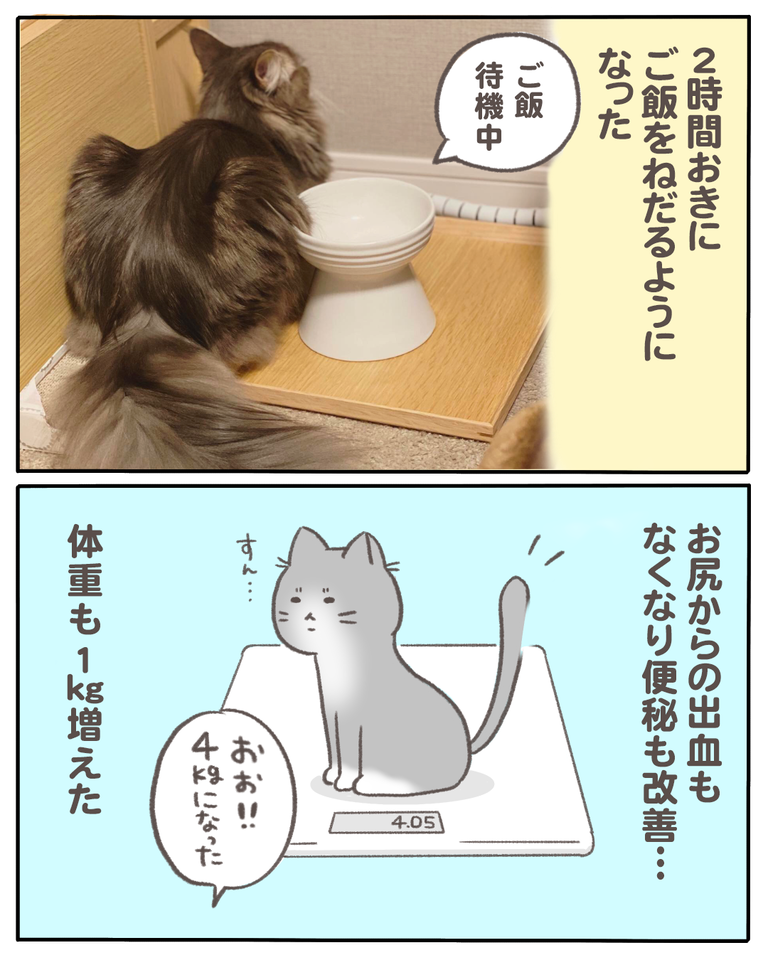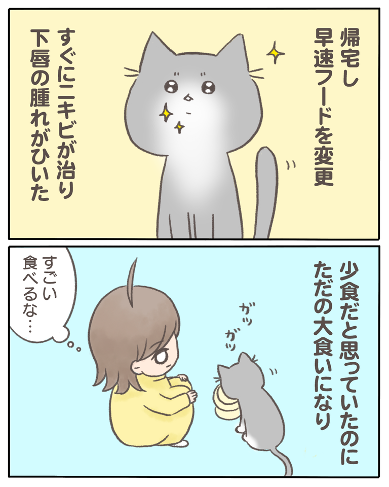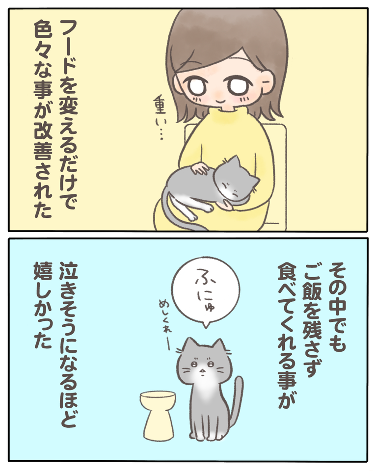 猫の『少食』の原因がわかった話【14】 2021/04/20 猫の『少食』の原因がわかった話14 1話から読む前の話はこちら フードを変えるだけで悩んでいたことが全てが良くなりました。小食も皮膚炎もお尻からの出血も…フードが原因だったようです。もっと早く気づいてあげていればなと思うこともありますが、諦めず原因を探って良かったなと思うようにしています。次回、最終回です。つづきはこちら ◯読者登録はこちら◯◯メインのブログ◯◯電子書籍◯ 「猫の『少食』の原因がわかった話」カテゴリの最新記事 < 前の記事次の記事 >